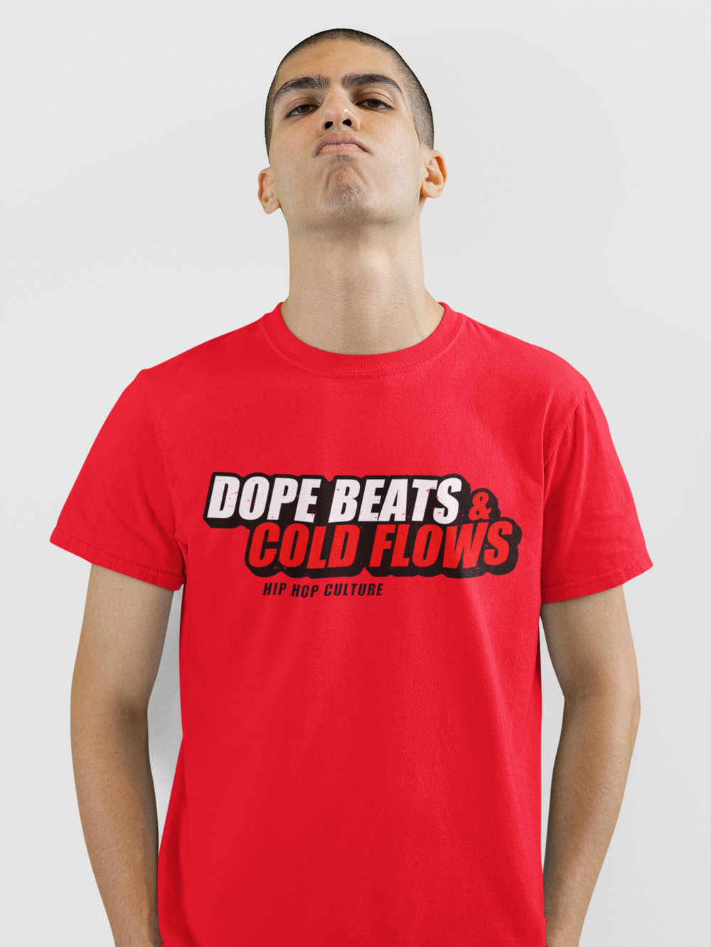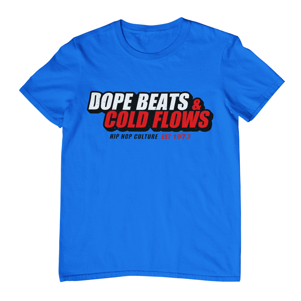 Presenting you an exclusive collection dedicated to 50 Years of hip hop culture featuring the quote Dope Beats & Cold Flows. Crafted from high-quality material, with limited edition graphic print, this short sleeve t-shirt is available, is easy to care for, and provides a comfortable fit. Shipping is free within the USA and UK, so don't wait - get your t-shirt today! The perfect gift to a loved one or your well-deserving self. A must for the individual who likes to stand out from the crowd.