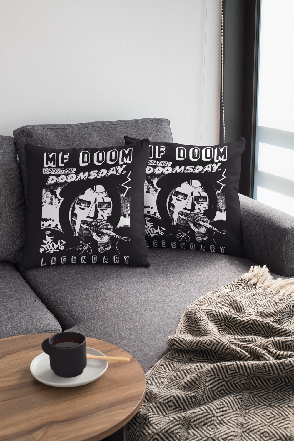 Bringing you a new, exciting, piece of hip hop inspired home decor, featuring, hip hip icon, MF DOOM. Available in faux suede, and linen, single or has a pair, handmade, and easily washable. A high-quality product that will make has a fantastic, cutting edge, feature on any bed, sofa, or chair. A must for any old school hip hop fan!